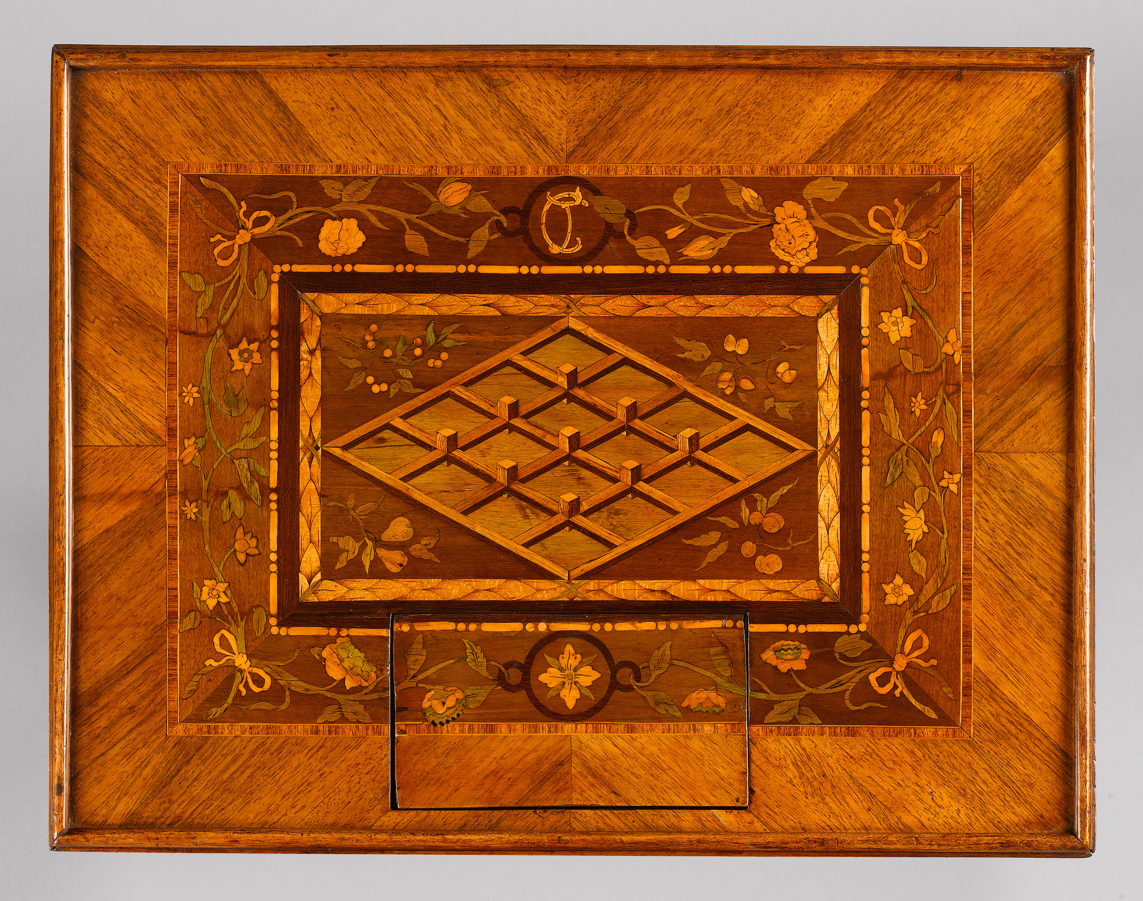 The stem supports the table top through a wooden thread. The rectangular top is embellished with an elaborate colourful marquetry, composed of contrasting geometrical and floral motifs. In the centre the interlaced monogram CT (of the Elector Carl Theodore). On the underside of the top is a turning pin-cushion, as well as guide rails to both sides, for two small drawers for sewing supplies, which are now lost.