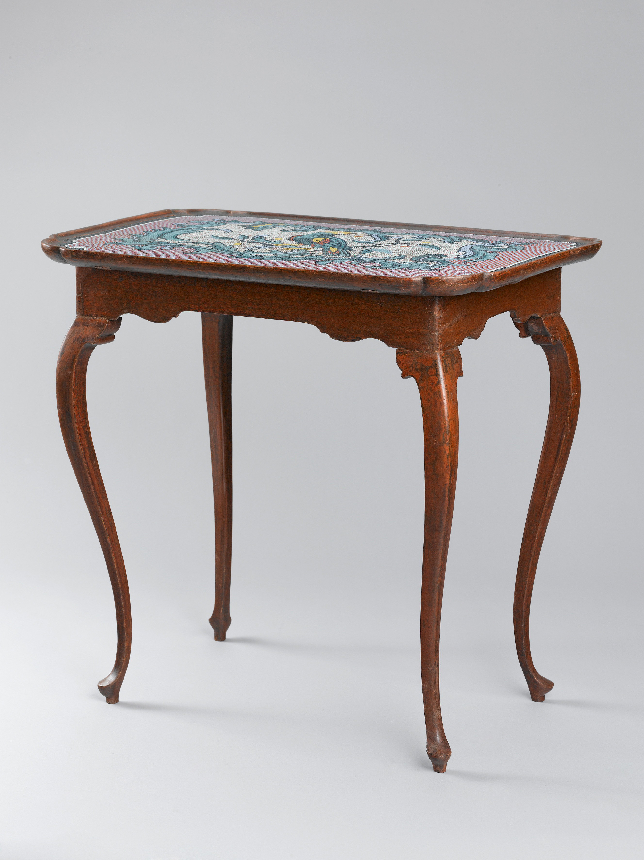 Oak and pine wood with historical paint and marbling. The rounded rectangular dished top with moulded edge and decorated with a mosaic made of glass beads depicting a parrot seated in a branch framed by scrolling foliage, above a plain frieze, on cabriole legs.