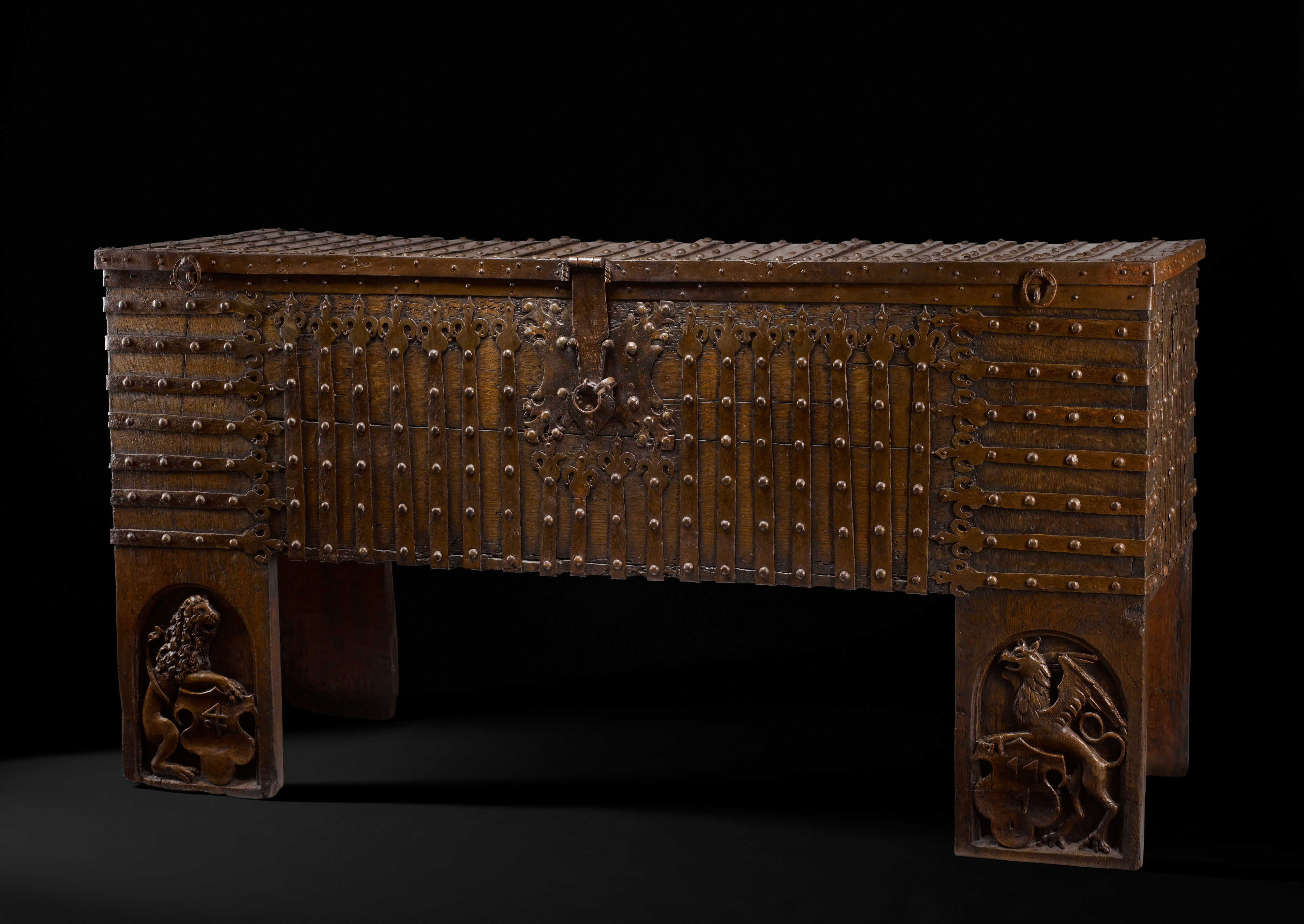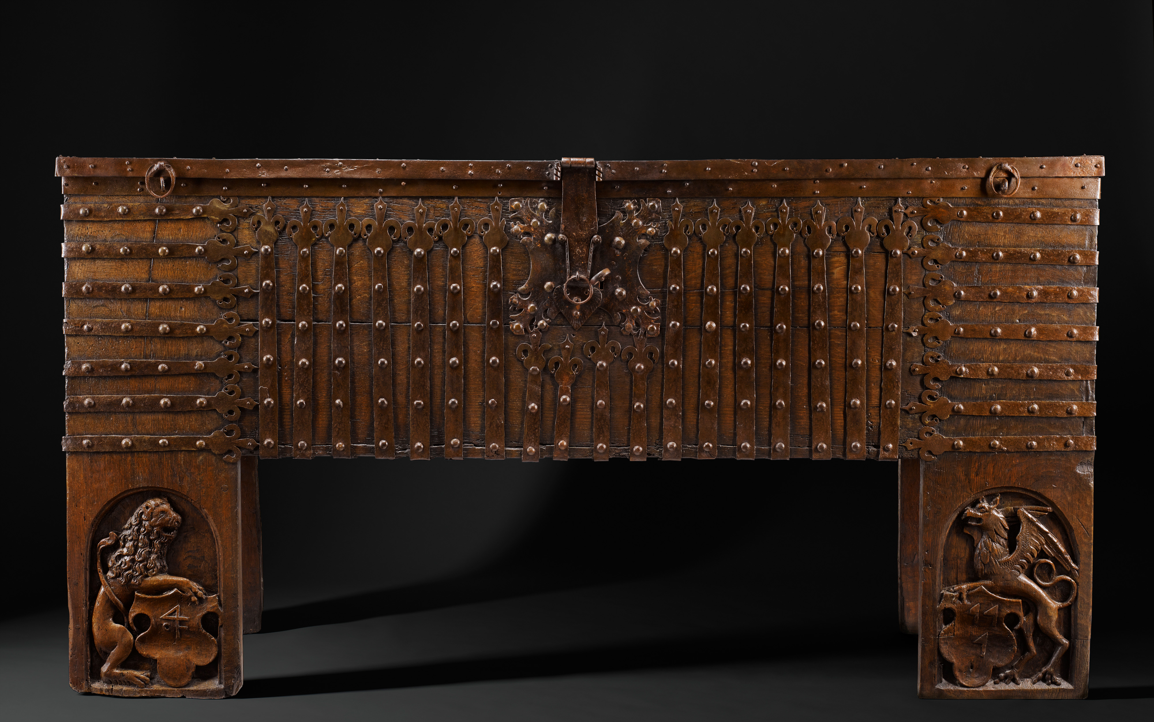 Below the floor of the chest, the two front legs are finely carved on the front face, in low relief with a arched ’panel’ depicting on the left a lion and on the right a griffin, each holding a coat of arms.