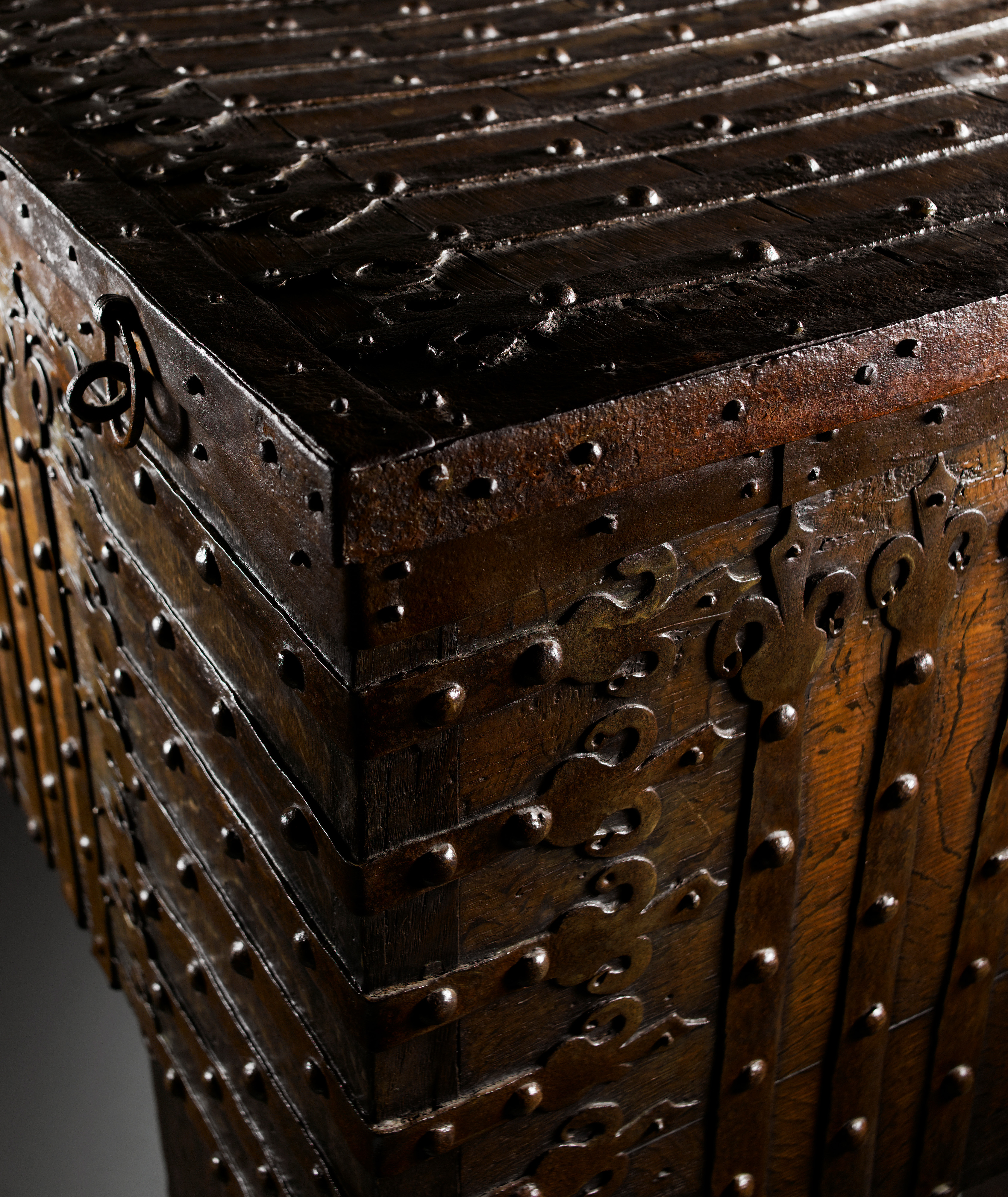 Rectangular standing chest with full-height stiles, extensively mounted with long ironwork straps with trefoil finials which ’wrap’ around the chest edges. These are fixed with convex head nails: running vertically up the front eighteen straps; running around both sides, seven C-shape horizontal straps; running from the back to the front of the lid twentyfive long straps. In addition, running along the edges of the lid at the front and sides is a plain iron band, close-nailed.