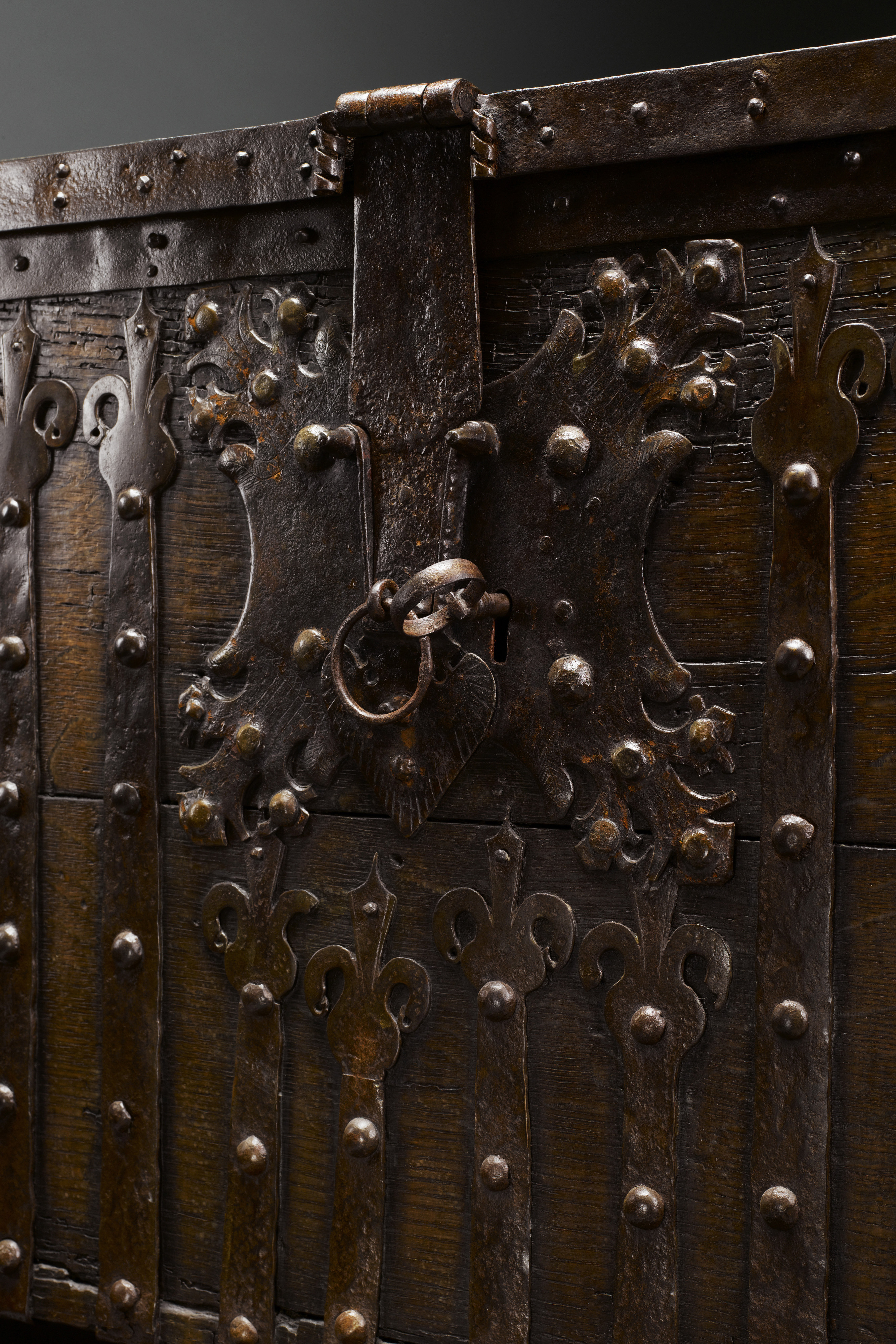 The central lock-plates on these chests are particularly impressive but in terms of security represent the weak point of the chest. In the same way as keys were displayed as a badge of status by officers of the household and women in medieval Europe, ornate locks on doors and chests were part of a concern to draw attention to household wealth and its distribution on controlled terms. Whatever the contents of such chests, they were a way to assert the authority of the owner.
