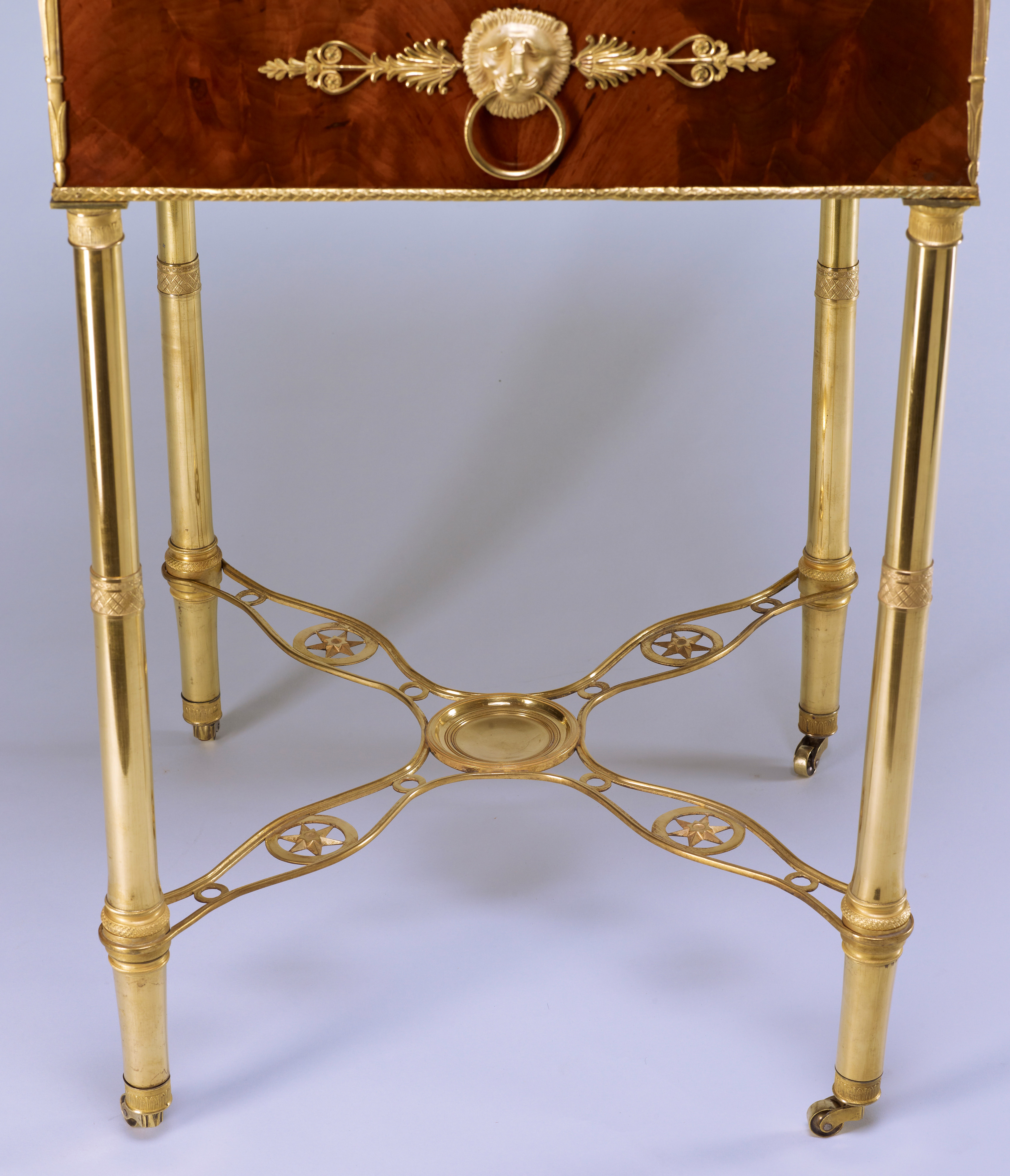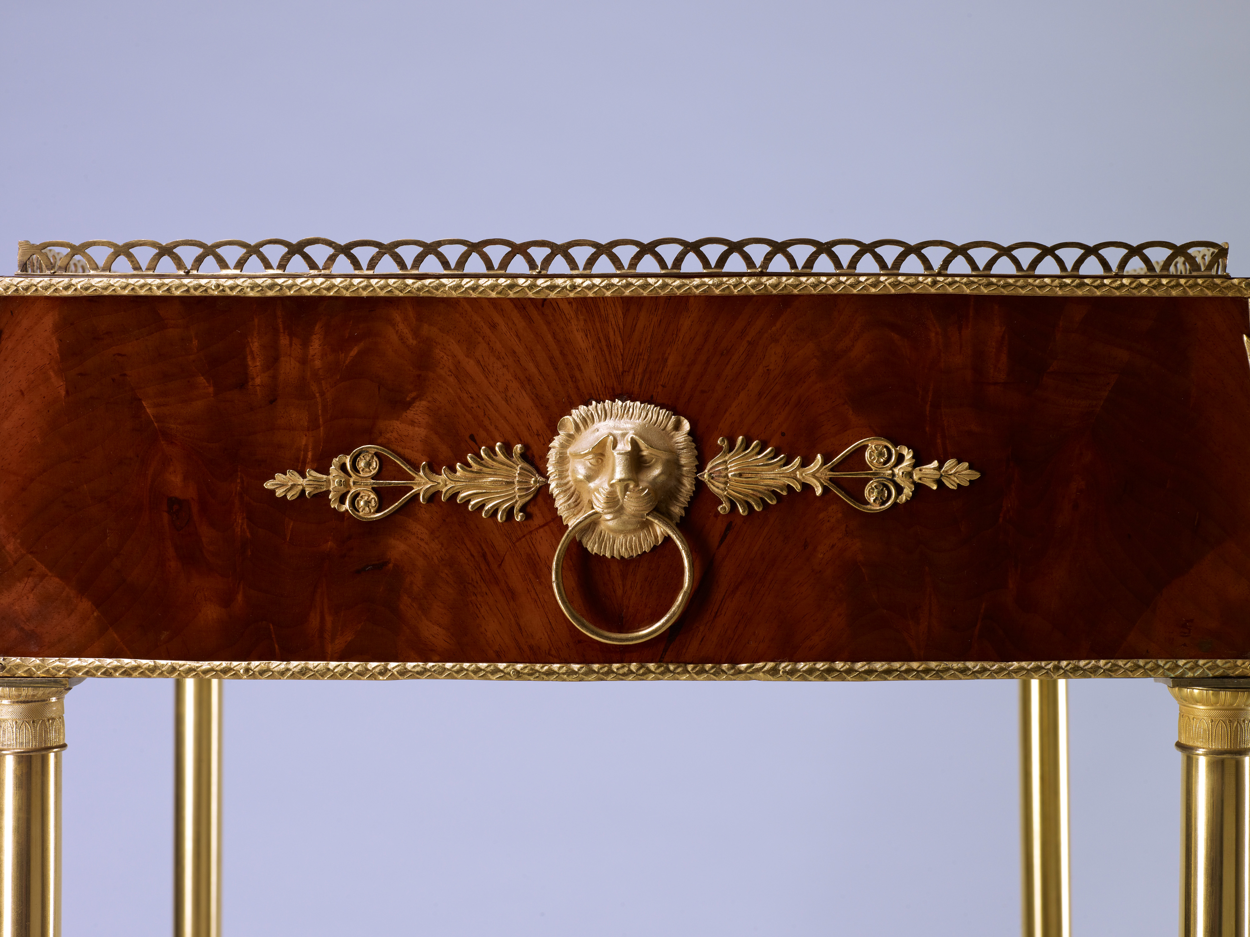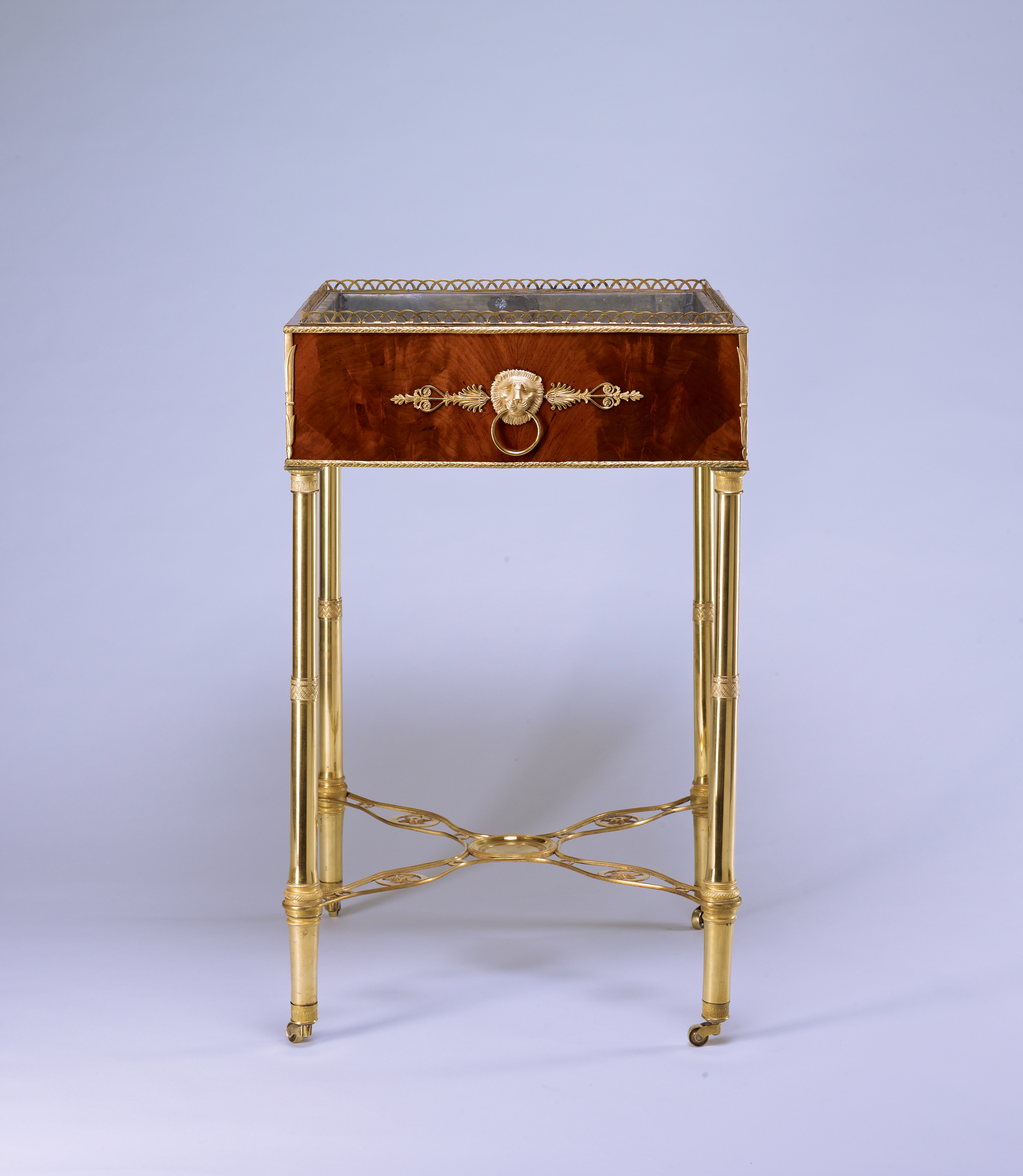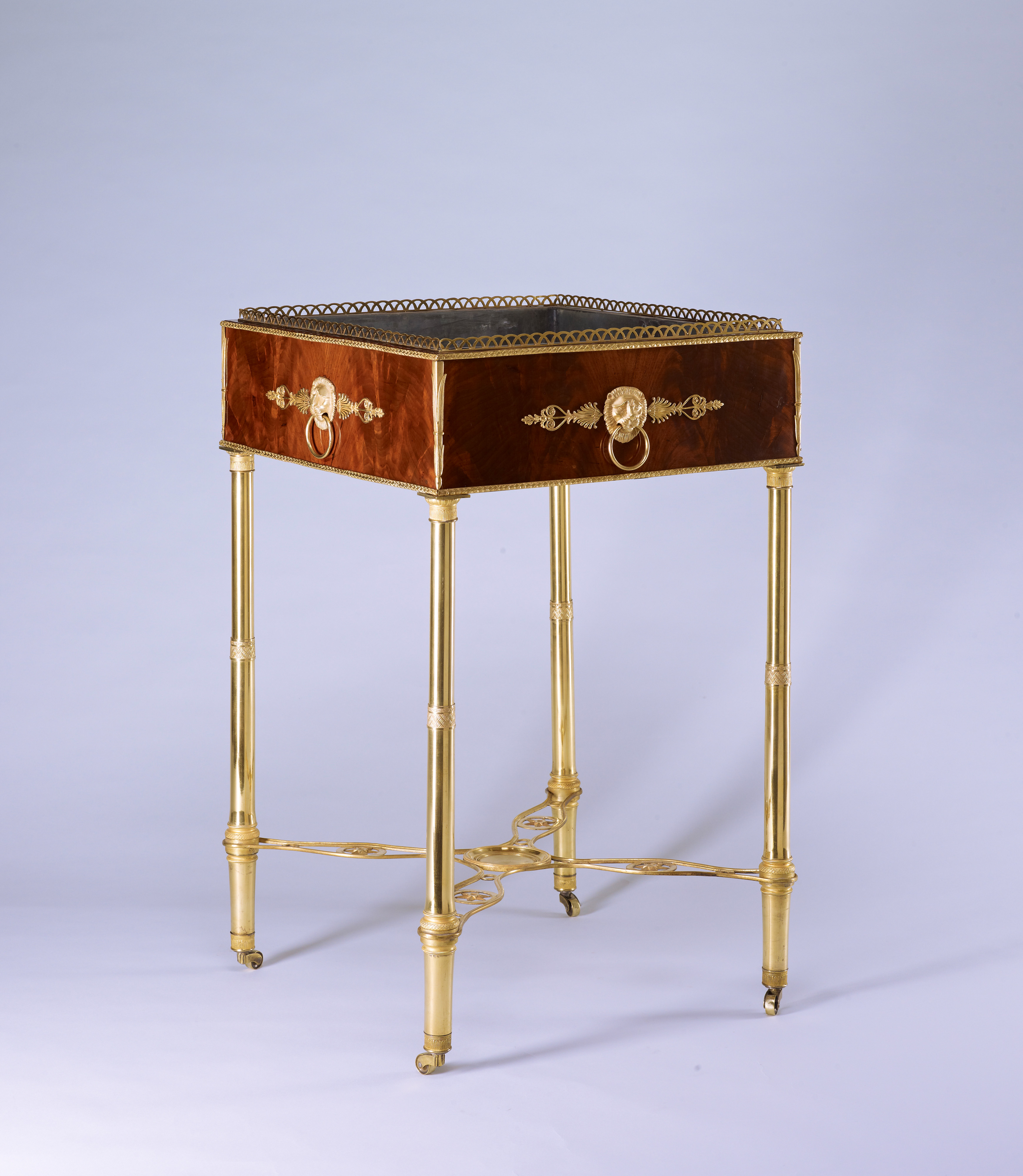 Das Möbel wird charakterisiert durch seine vier hohen säulenförmigen Beine aus feuervergoldeter Bronze, die durch einen ornamental durchbrochenen Fußsteg aus Bronze verbunden sind. Der Zargenabschluß wird auf der Innenkante mit einer Bronzegalerie gesäumt. Alle vier Zargen werden in ihrem Zentrum besetzt durch eine Löwenmaske mit Griffring, flankiert von stilisierten Palmettenappliken aus vergoldeter Bronze. Die Beschläge sind außerordentlich fein ziseliert und im Detail sorgfältig ausgeführt. Die Ausführung des Jardinièren-Gestells, vollständig in feuervergoldeter Bronze, ist ungewöhnlich selten und kostbar zugleich.