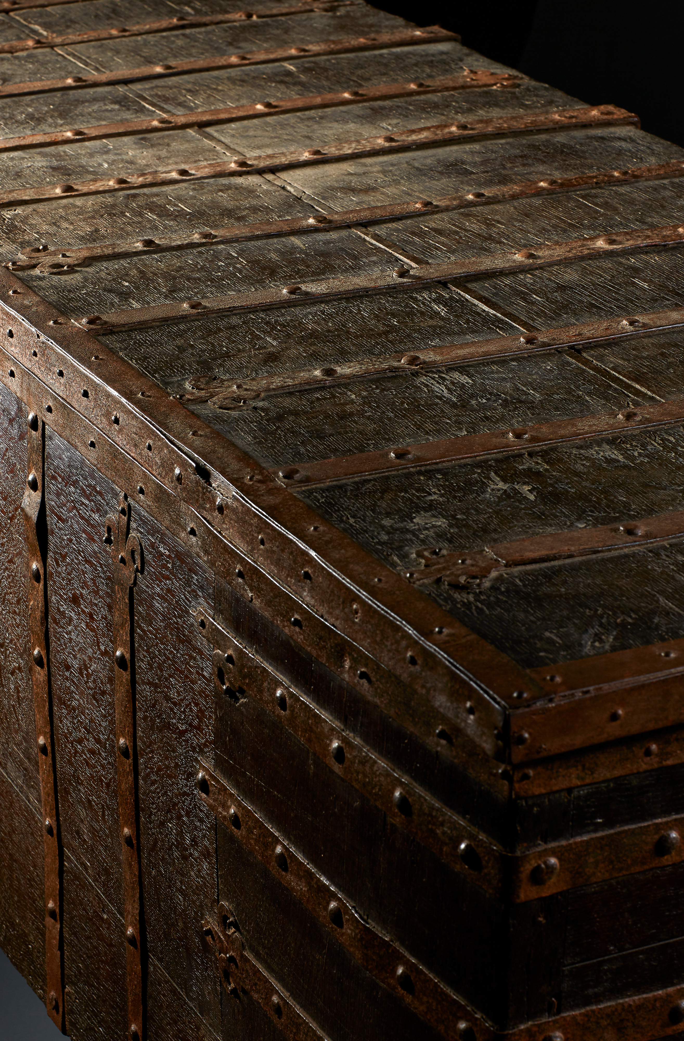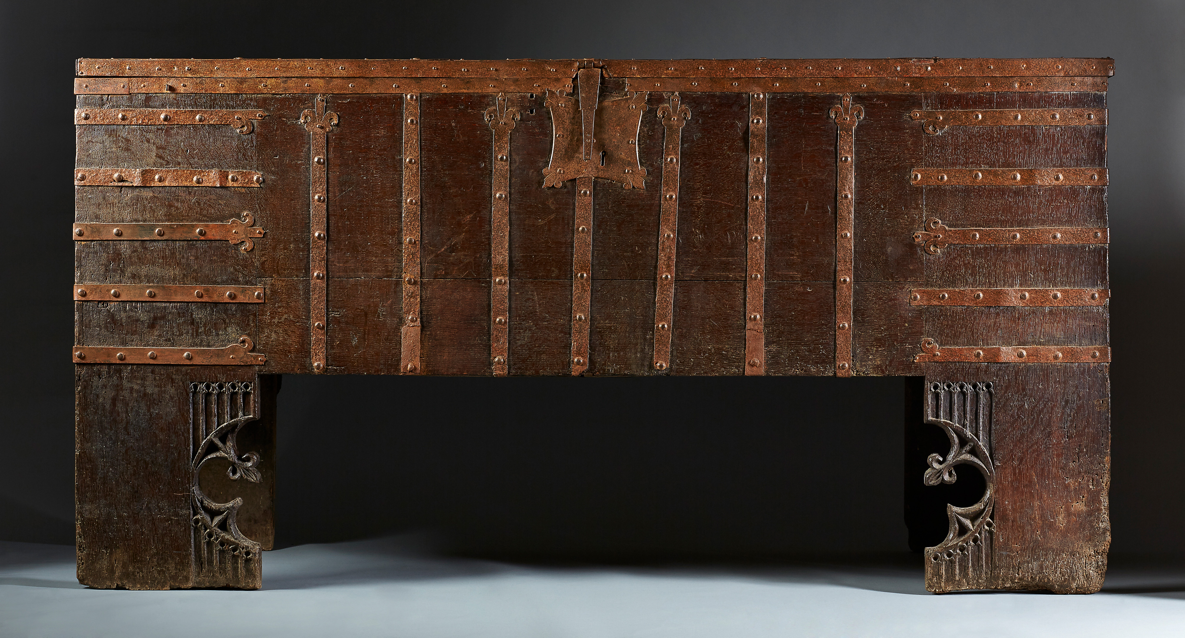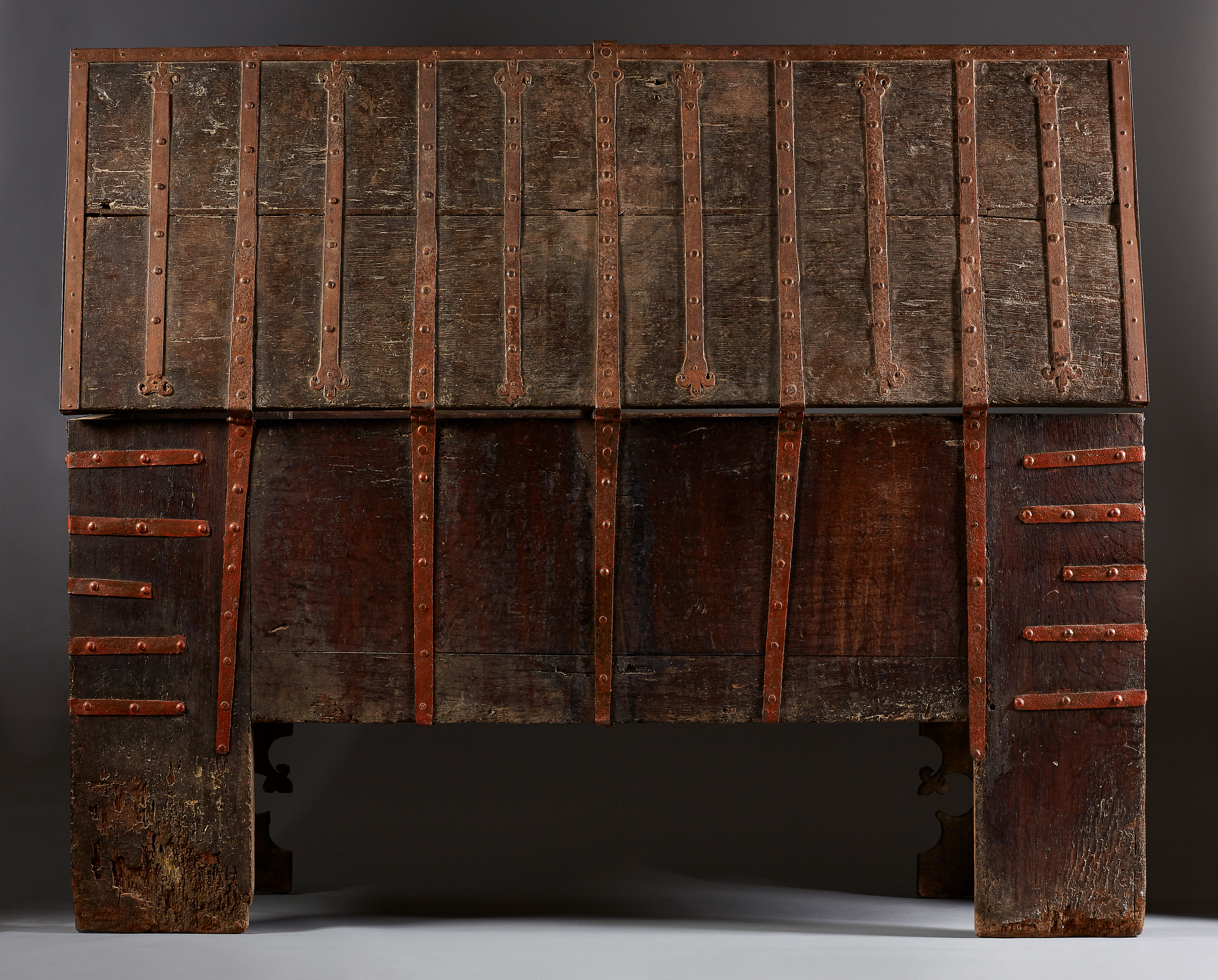 The monumental rectangular standing chest with full-height stiles, extensively mounted with wrought ironwork straps terminating in lily finials which ’wrap’ around the chest edges. These are fixed with convex head nails: running vertically up the front seven straps; running around both sides, five C-shape horizontal straps; running from the back to the front of the lid eleven long straps. The ironwork with some remains of an originally red painted surface. In addition, running along the edges of the lid at the front and sides is a plain iron band, close-nailed.