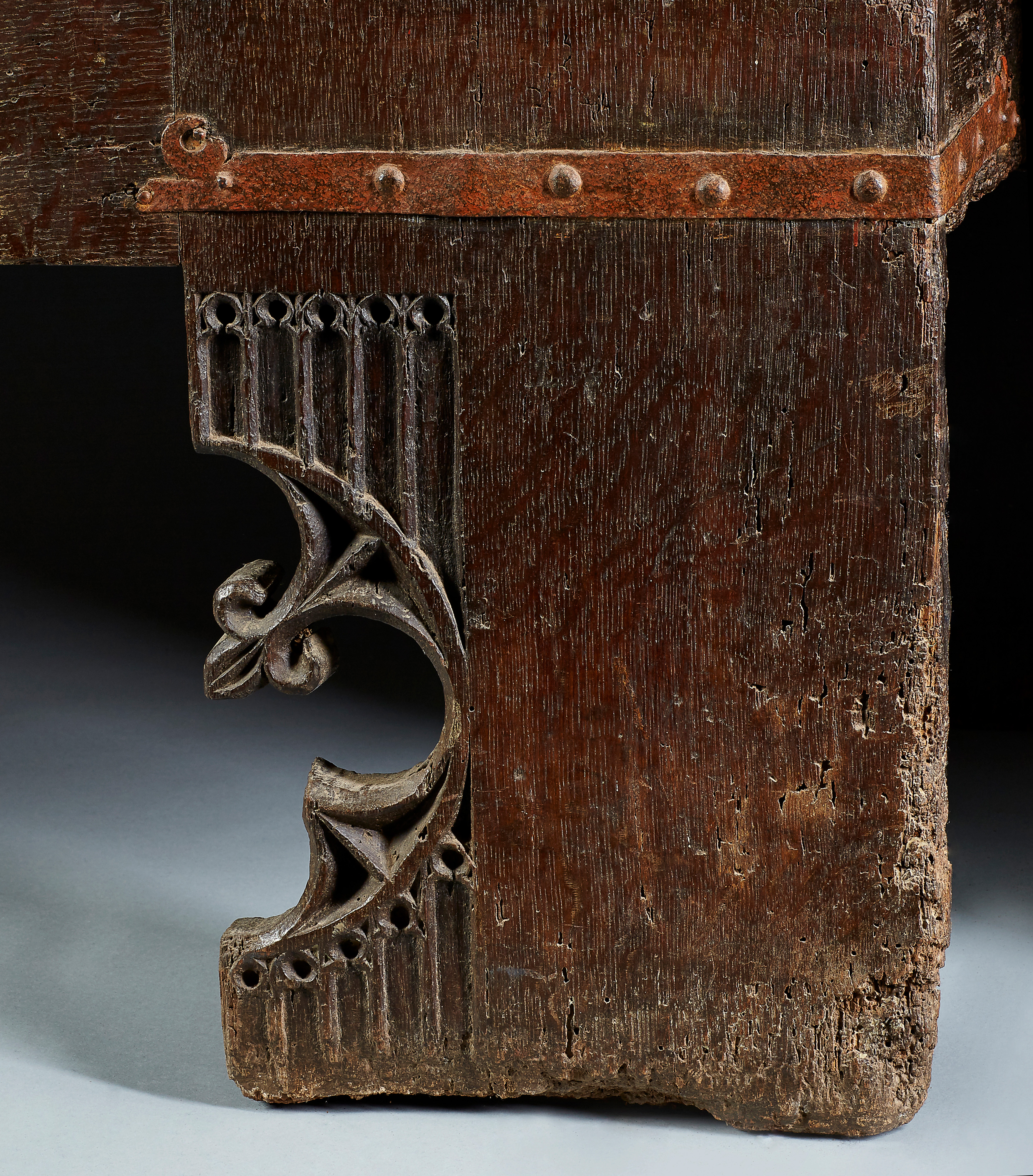 On the chest front, centrally placed, is a quatrefoil iron lockplate with four corner trefoil finials, which receives a corresponding external hasp fitted to the lid. Below the floor of the chest, the two front legs are finely carved on the front face, in low relief with a rectangular ’panel’ depicting ornaments taken from Gothic architecture, two arcades of small arches are enclosing a half quatrefoil terminating in a fleur de Lys.