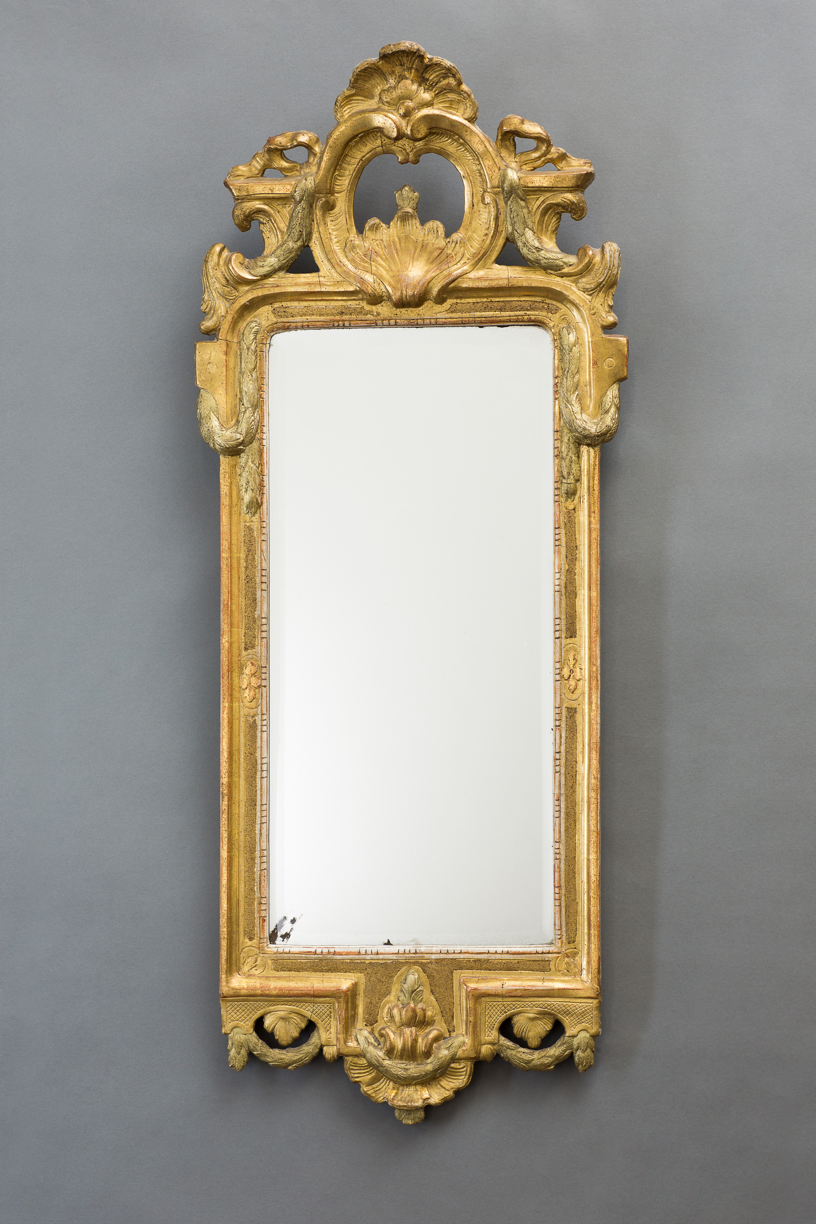 A fine Swedish Gustavian carved two-tone giltwood mirror signed with a by the master mirror maker Johan AÌŠkerblad (1728-1799) and with the stamp of the Stockholm gilt (hallstämpel). Åkerblad was one of Sweden’s most prominent and prolific mirror maker, working mainly in the Rococo and Gustavian styles. The divided rectangular plate within a beaded and moulded frame surmounted by a large pierced cresting consisting of shell motifs, c-scrolls, ribbons and laurel swags. In superb condition, with the original faceted mirror glass and back with a nice patina.