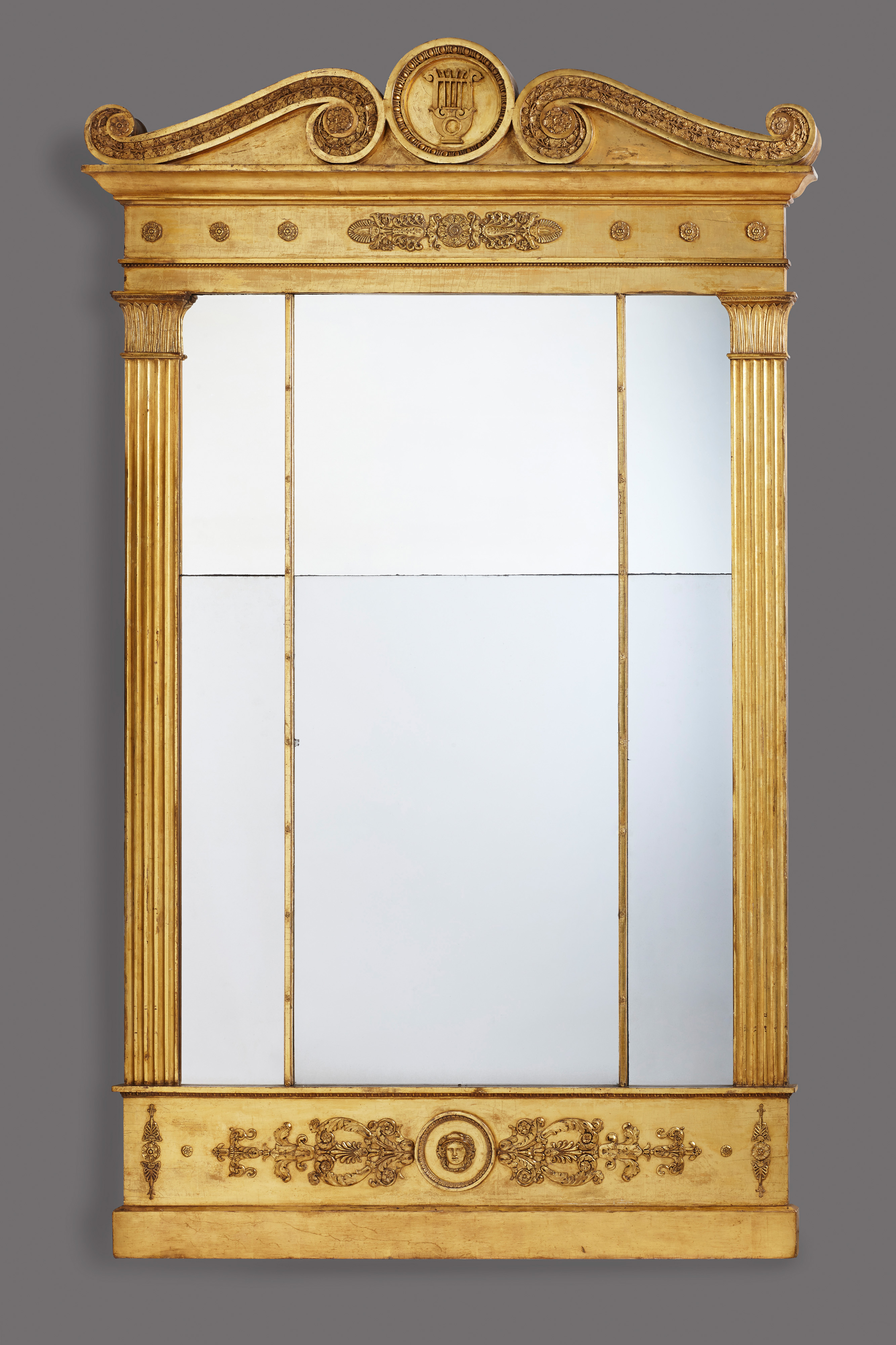 A rare early 19th century German Empire giltwood trumeau mirror. The large rectangular plate surmounted by a scrolled pediment enriched with wines leaves and a central medallion enclosing a classical lyre. The sides of the mirror are fashioned as fluted pilasters with gilt capitals. The whole above a base enriched with further neo-classical ornaments centred by a roundel with the head of Apollo.