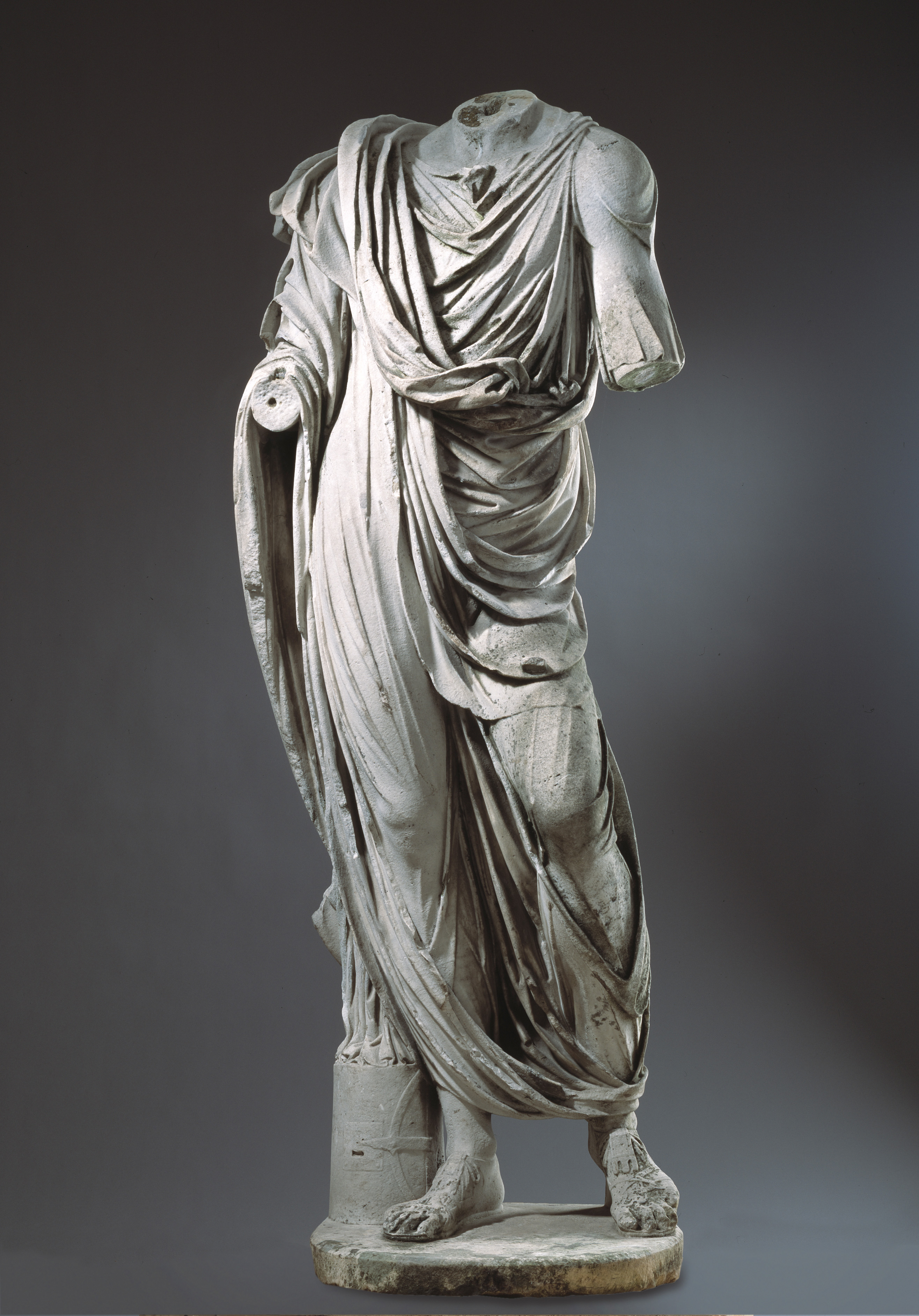 The thesis that this marble statue is probably the representation of a philosopher is confirmed by the attribute next to the right foot: a sealed box for important scrolls, ”scrinium” (lat.).