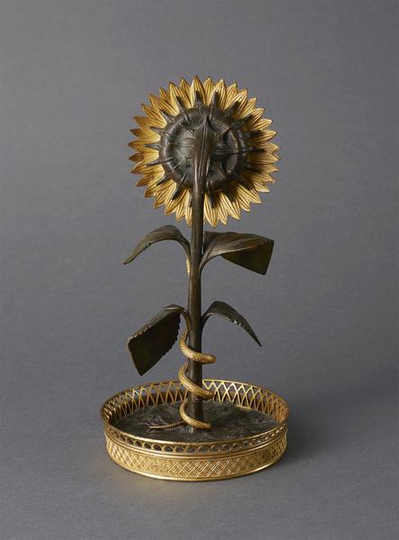 The naturalistically cast sunflower with a detachable bezel inset with a fine watch movement, with white enamelled dial and arabic hours above a foliate stem with an entwined serpent, rising from a circular foliate cast base surrounded by a pierced rim.