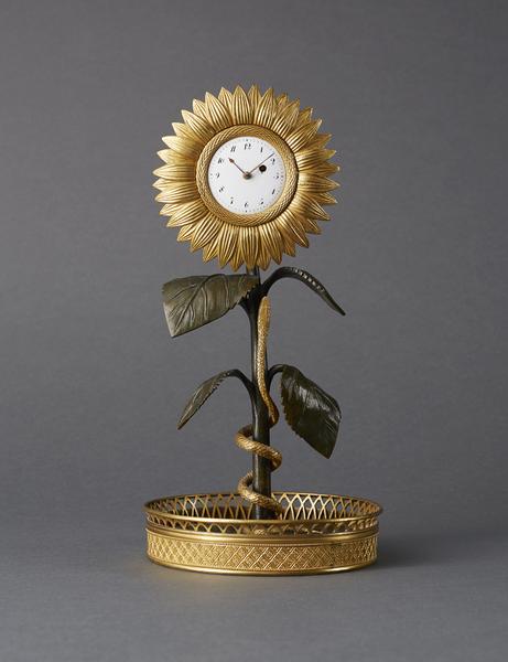 The sunflower is a clear allusion to the sun god Apollo and this clock might be inspired by the Metamorphoses of the Latin poet Ovid, which recounts the love affairs of the Olympian gods. The water nymph Clytia was jilted by Apollo, who preferred her older sister Leucothea. Despairing, she refused all nourishment except her own tears and the morning dew. From dawn to dusk she contemplated the path of the sun in the sky. After nine days, Apollo changed the young nymph into a heliotrope, or sunflower. Additionally, the property of a sunflower always to turn to the Sun, alludes to the deference owed to a sovereign, as in the self-portrait of van Dyck with a sunflower, indicating the artist’s unswering devotion to his patron, king Charles I. of England.